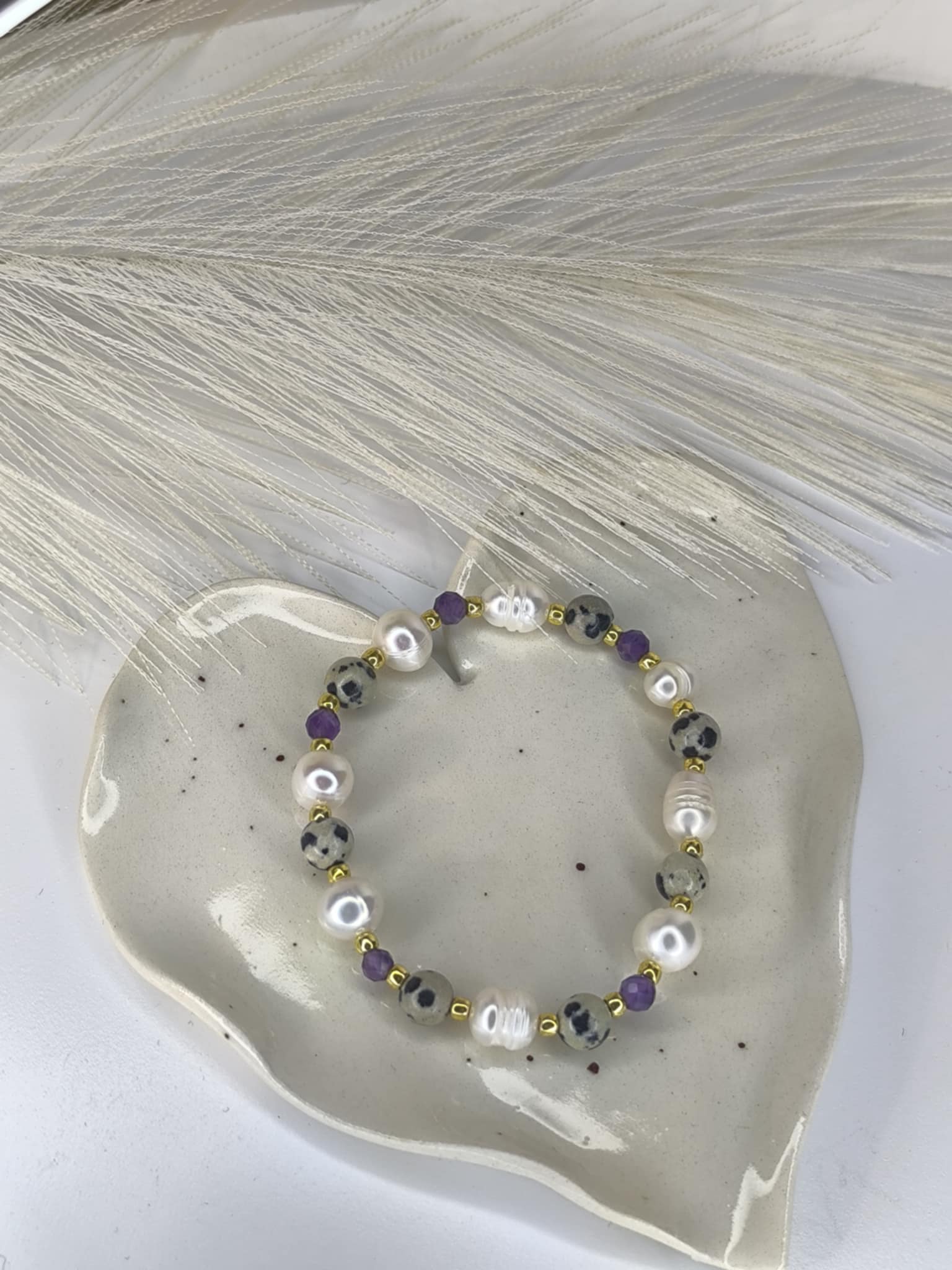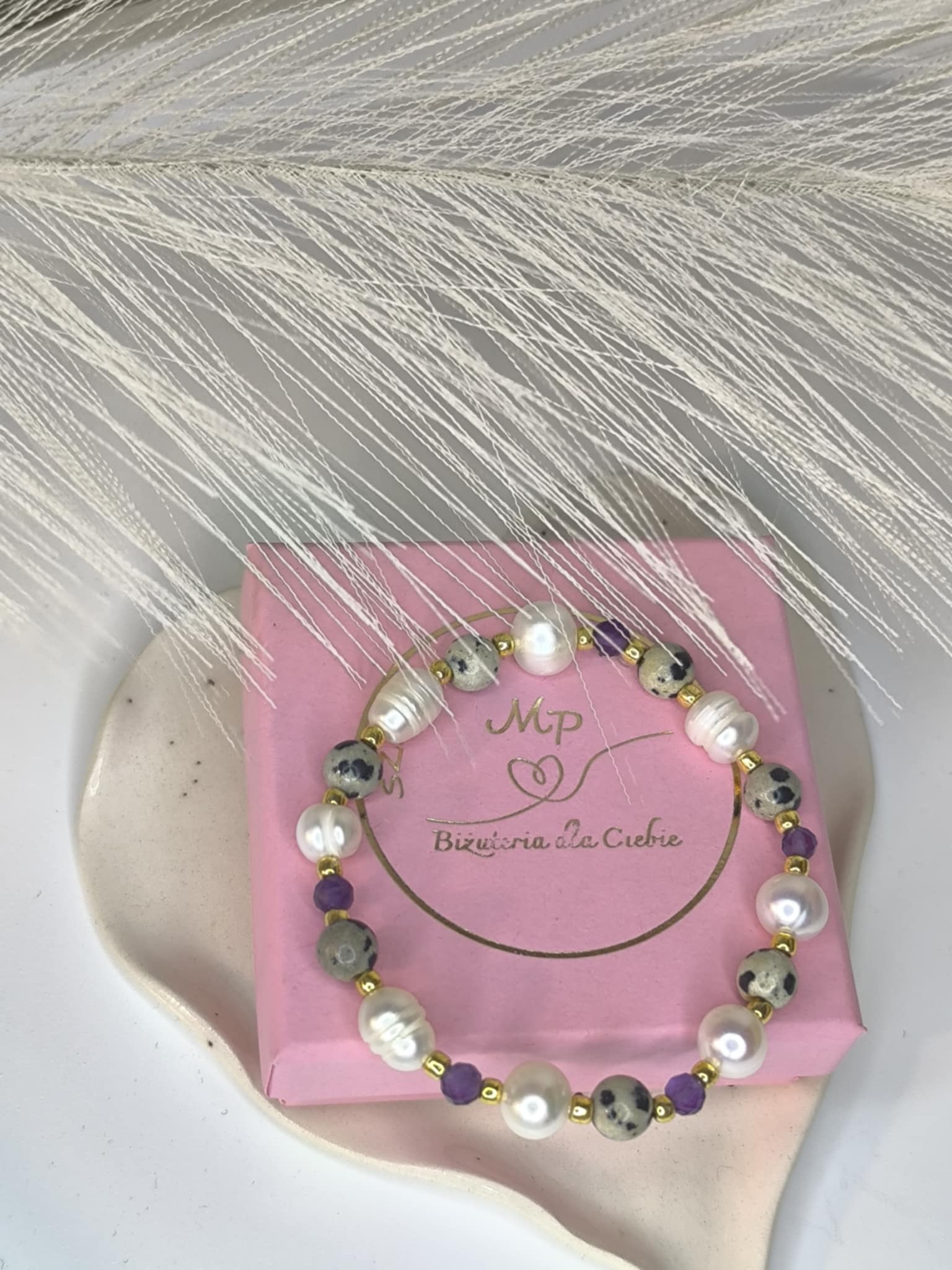 Aurora Dalmatia-  Delikatna bransoletka, a jednocześnie pełna charakteru. Łączy w sobie elegancję naturalnych pereł, radość jaspisu dalmatyńskiego i duchową głębię ametystu. Zaprojektowana z dbałością o każdy szczegół, powstała z myślą o kobietach, które kochają subtelne piękno i biżuterię z duszą. Każdy kamień został dobrany tak, by tworzył harmonijną opowieść o spokoju, kobiecości i sile płynącej z natury.